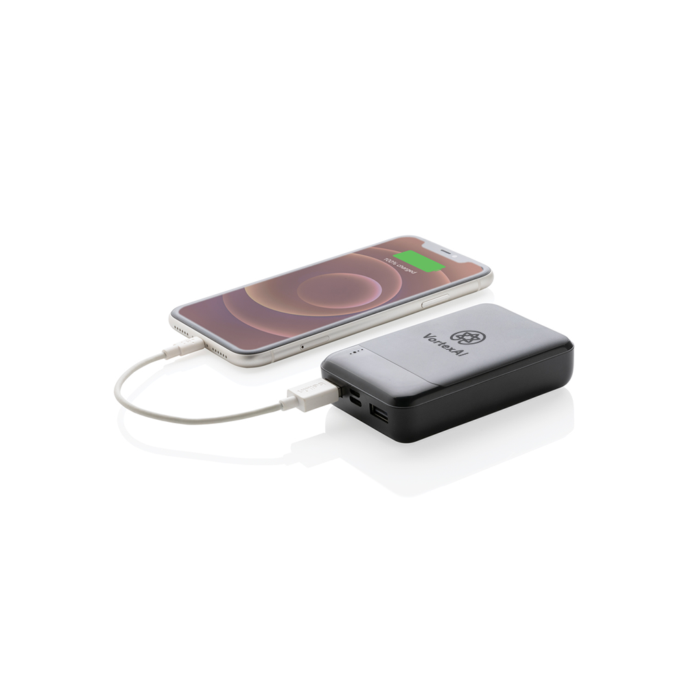 Restez chargé où que vous soyez! Cette batterie externe est fabriquée à partir de matériaux recyclés certifiés RCS. Elle peut recharger votre mobile jusqu'à cinq fois une fois complètement chargée. Les indicateurs de puissance vous assurent de toujours savoir quand il est temps de recharger. Livrée avec un câble de charge en TPE recyclé sans PVC. Parfait pour les amateurs de technologie éco-responsable!
