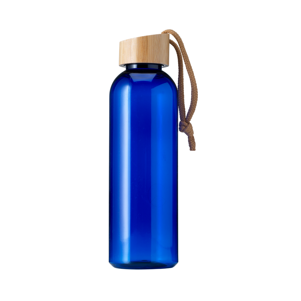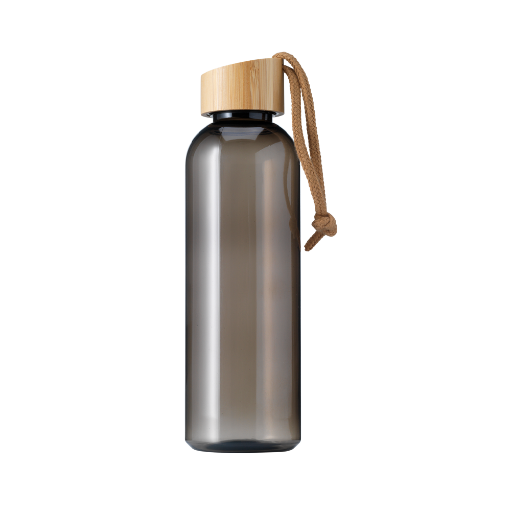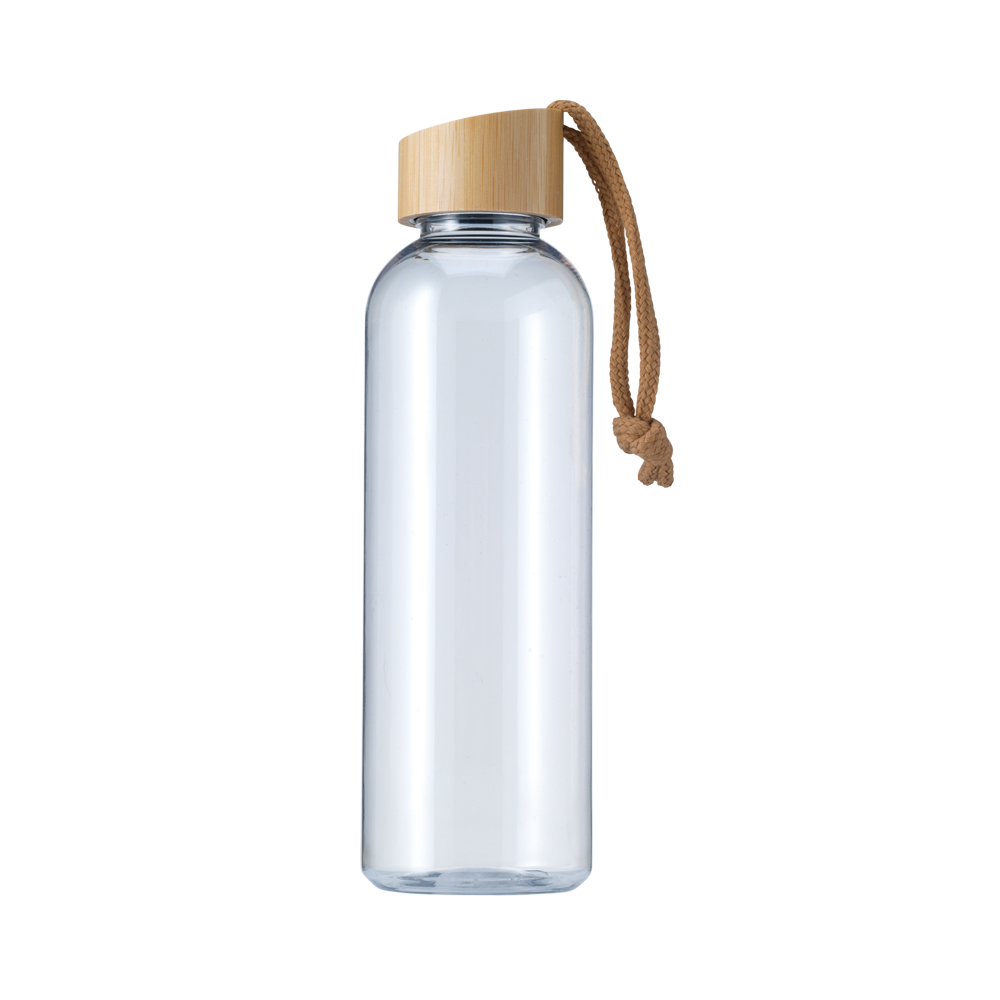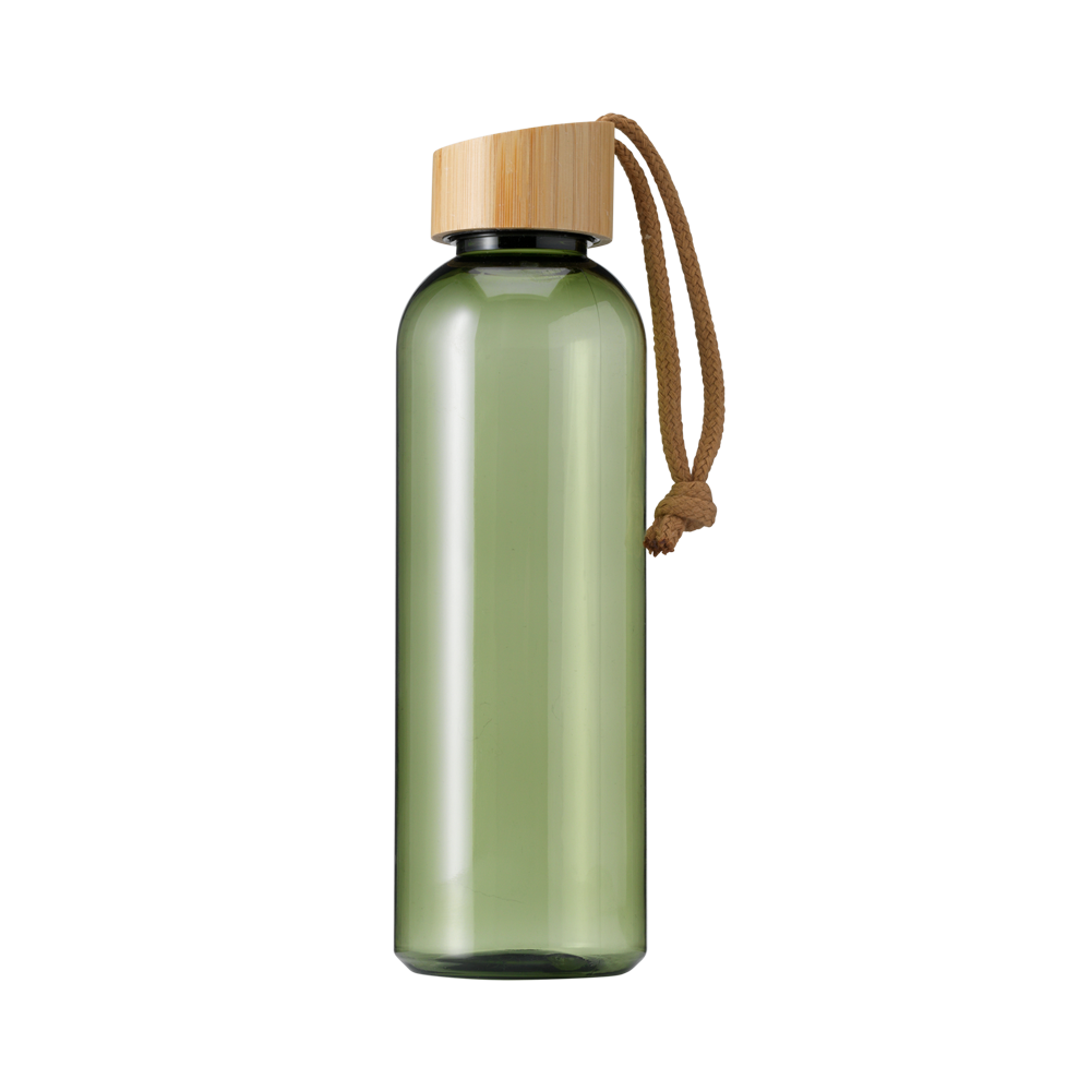 Restez hydraté en déplacement avec cette bouteille de boisson RPET écologique dotée d'un capuchon en bambou étanche et d'un cordon de transport pratique. Mince dans sa conception et confortable à tenir, cette bouteille n'est pas lavable au lave-vaisselle.