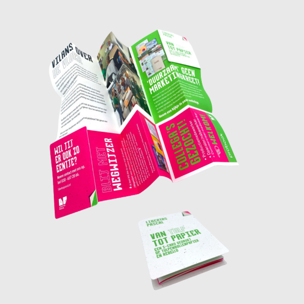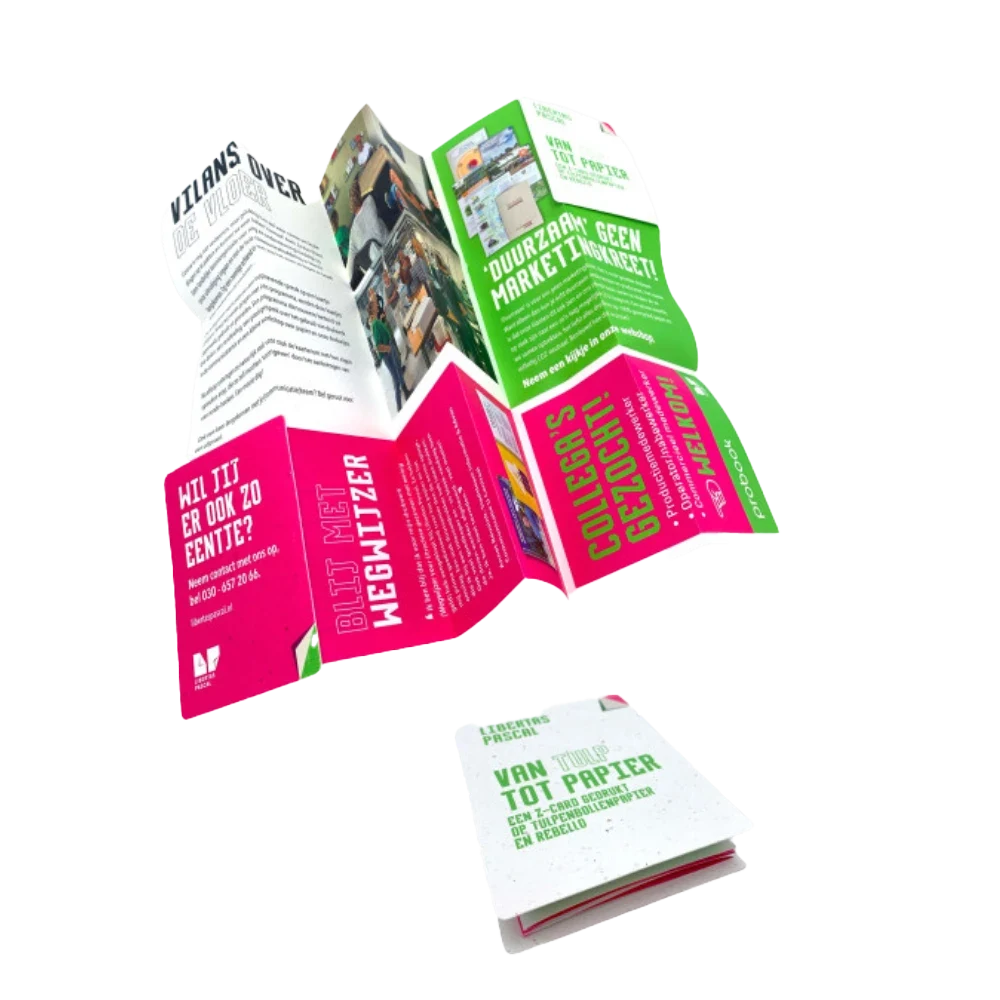 Vous cherchez un moyen pratique et accrocheur de communiquer des informations détaillées ? Nos cartes à pliage en Z sont la solution compacte idéale. Avec jusqu’à 36 panneaux imprimables au recto et au verso, les cartes à pliage en Z offrent beaucoup d’espace pour des guides pas à pas, des plans d’étage, des infographies ou du contenu promotionnel, sans compromis sur la taille ou la portabilité. Elles sont idéales pour les plans de ville, les programmes d’événements, les guides d’hôtels ou les brochures de musées.