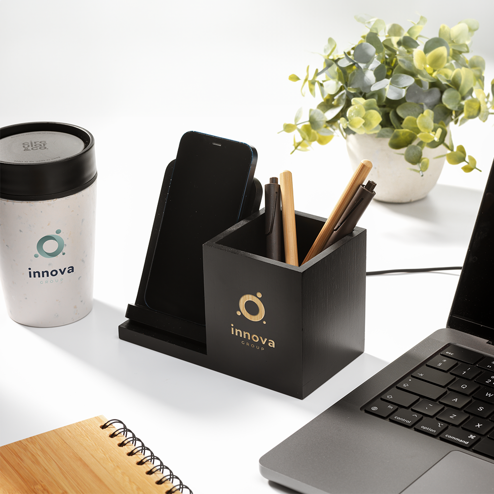 Polyvalent et éco-responsable, ce support de charge sans fil 15W fait également office de range-stylo. Conçu en bambou naturel, il est idéal pour recharger vos appareils mobiles compatibles et organiser votre bureau. Il inclut un câble USB-A sans PVC avec un connecteur USB-C et un manuel d'utilisation. Organisez votre espace avec style grâce à cet accessoire éco-responsable !