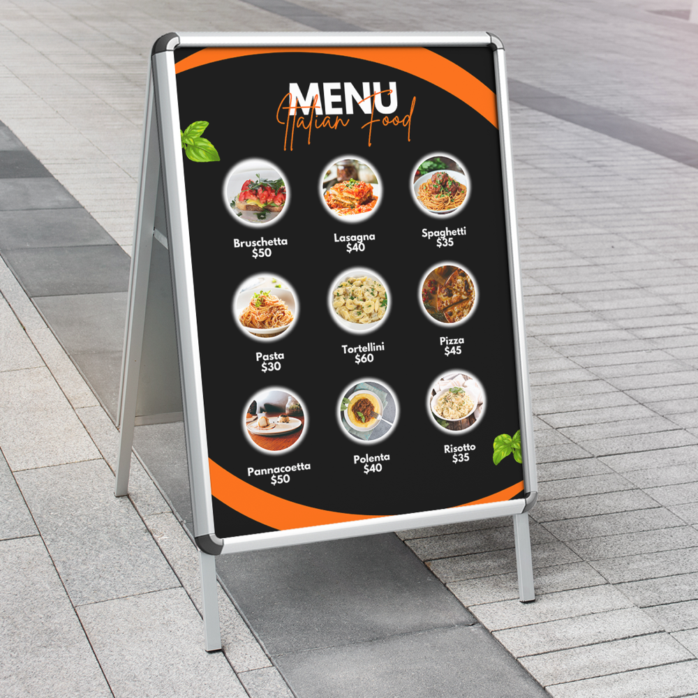 Un stop trottoir attire le regard vers votre magasin ou restaurant. Il dispose d’un cadre pour insérer une affiche ou un tableau noir classique. Les tableaux sont disponibles en différents types et coloris.