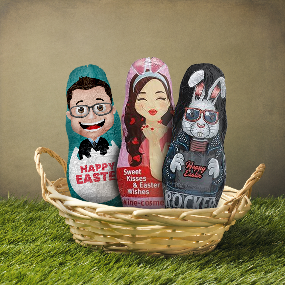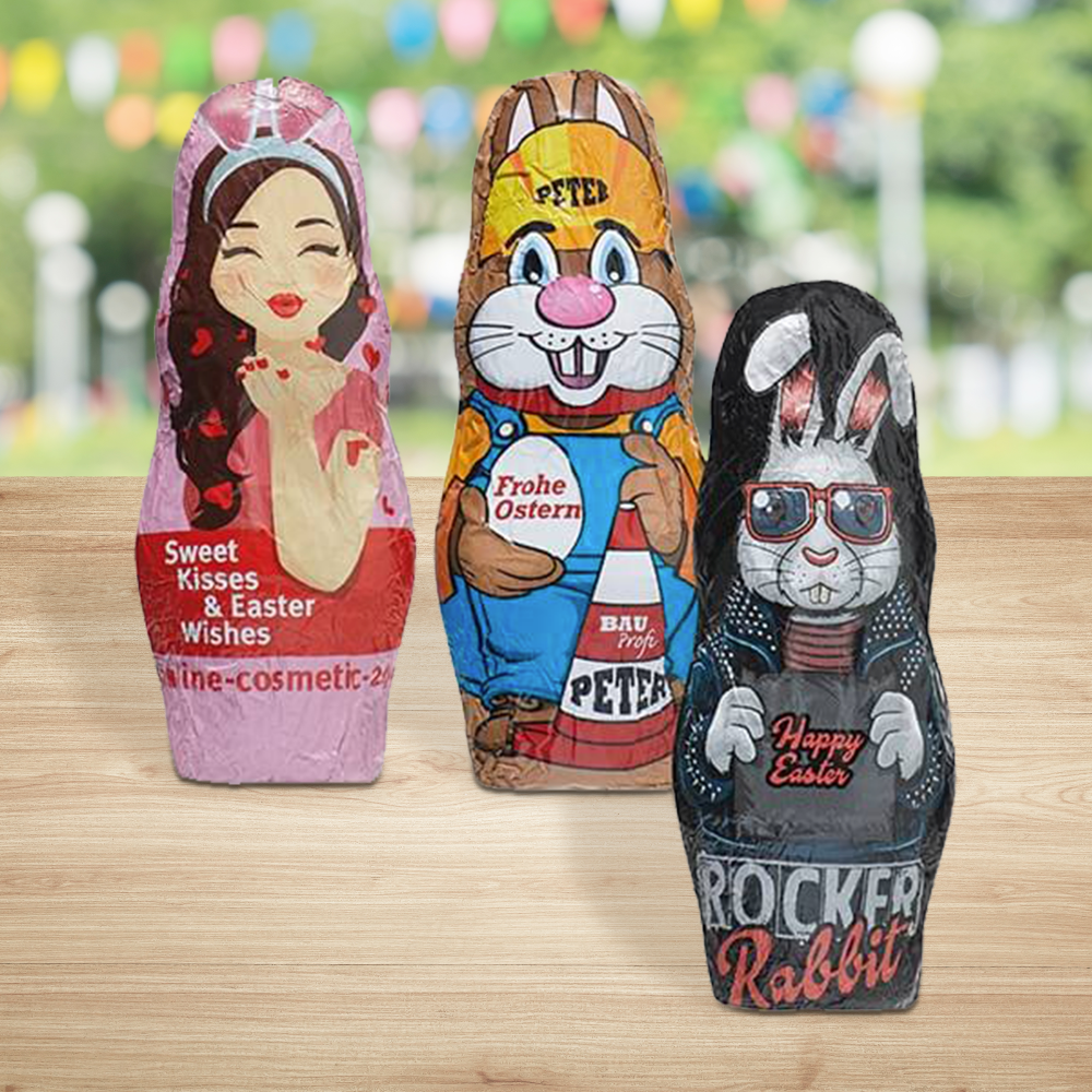 Figurines en chocolat de Pâques est l'un de nos produits chocolatés les plus populaires. Tout le monde aime le chocolat, et ce produit est le choix idéal à ajouter dans un sac cadeau à des fins promotionnelles, ou à laisser dans un bol au bureau/à l'exposition pour que vos clients potentiels aient un avant-goût de ce que vous pouvez offrir !