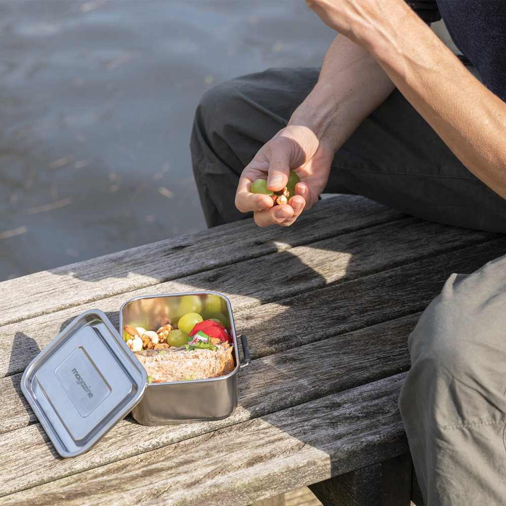 Optez pour une solution durable et éco-responsable pour vos repas. Cette lunch box robuste avec fermetures à clip est fabriquée en acier inoxydable recyclé. Elle garde vos aliments frais plus longtemps. Idéale pour l'école ou le bureau. Facile à nettoyer mais évitez le lave-vaisselle et micro-ondes. Seulement pour aliments froids. Livrée dans un emballage durable.