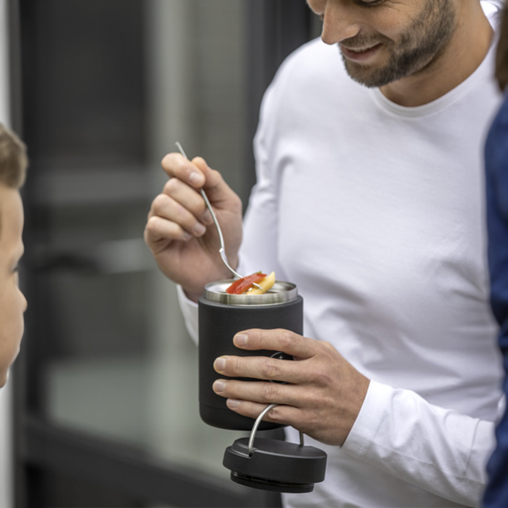 Dites adieu aux contenants jetables! Ce pot isotherme est fabriqué en inox recyclé, offrant une alternative éco-responsable. Garde les aliments chauds pendant des heures ou froids toute la journée. Emballé dans un emballage recyclé. Remarque : ne passe pas au lave-vaisselle ni au micro-ondes.