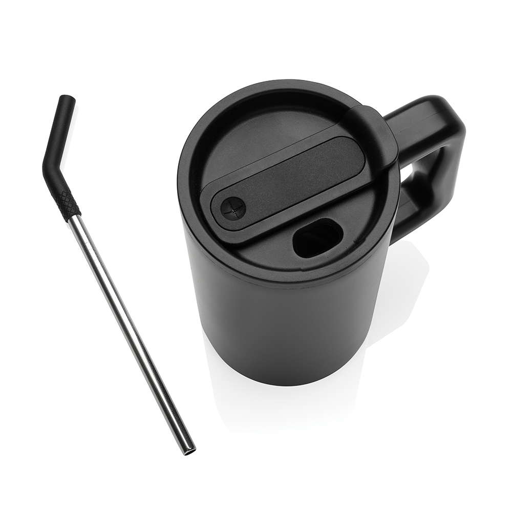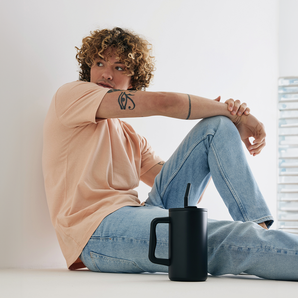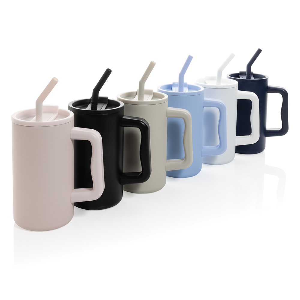 Restez hydraté avec ce mug robuste et grande capacité. Parfait pour votre bureau, il possède une poignée solide et une base large. Fabriqué en acier inoxydable recyclé, il est doté d'un couvercle sécurisé, d'une paille et d'un embout en silicone. Idéal pour les boissons chaudes ou froides, le couvercle à vis offre une option bec ou paille.