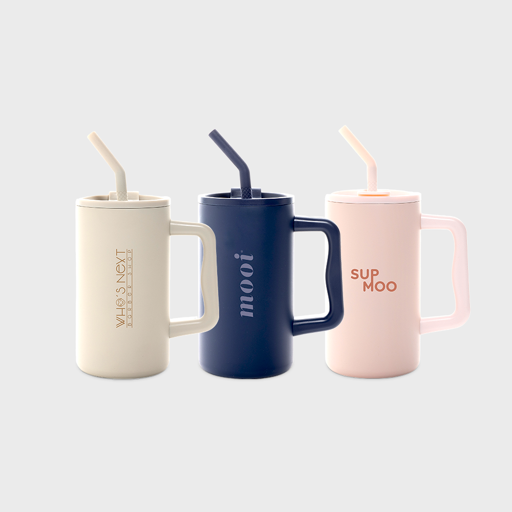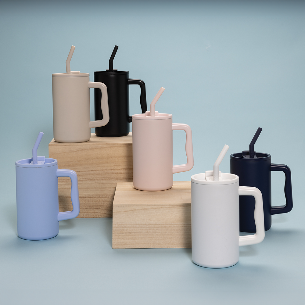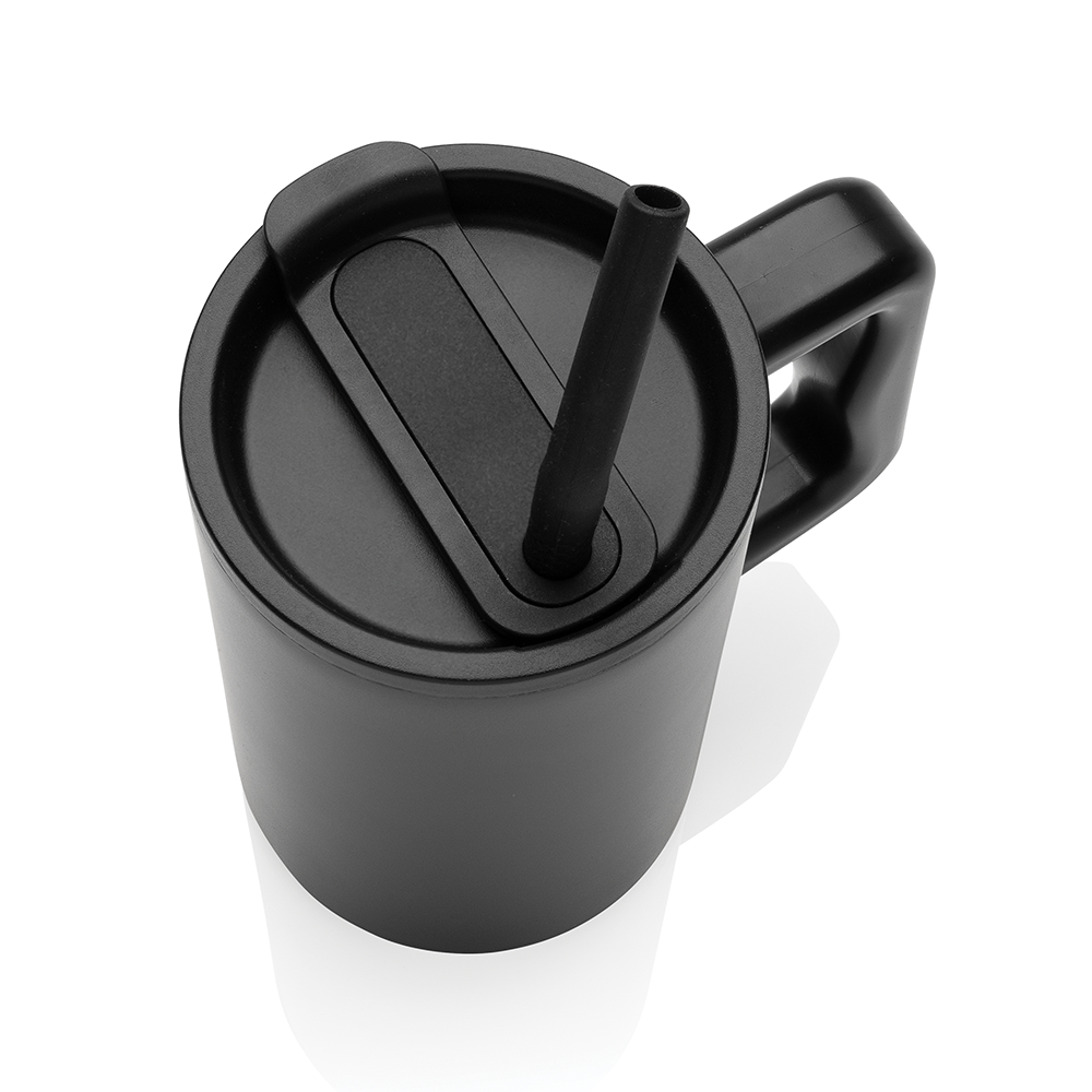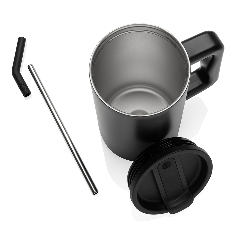 Restez hydraté avec ce mug robuste et grande capacité. Parfait pour votre bureau, il possède une poignée solide et une base large. Fabriqué en acier inoxydable recyclé, il est doté d'un couvercle sécurisé, d'une paille et d'un embout en silicone. Idéal pour les boissons chaudes ou froides, le couvercle à vis offre une option bec ou paille.