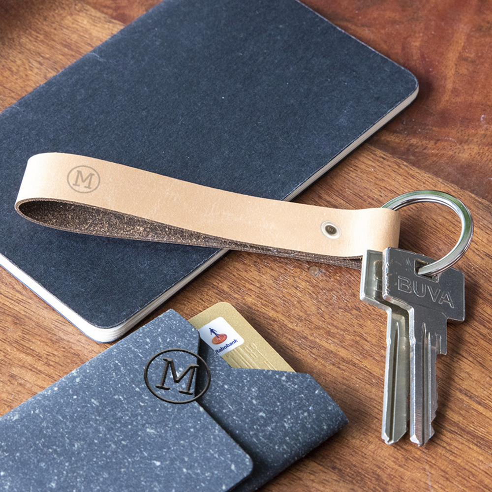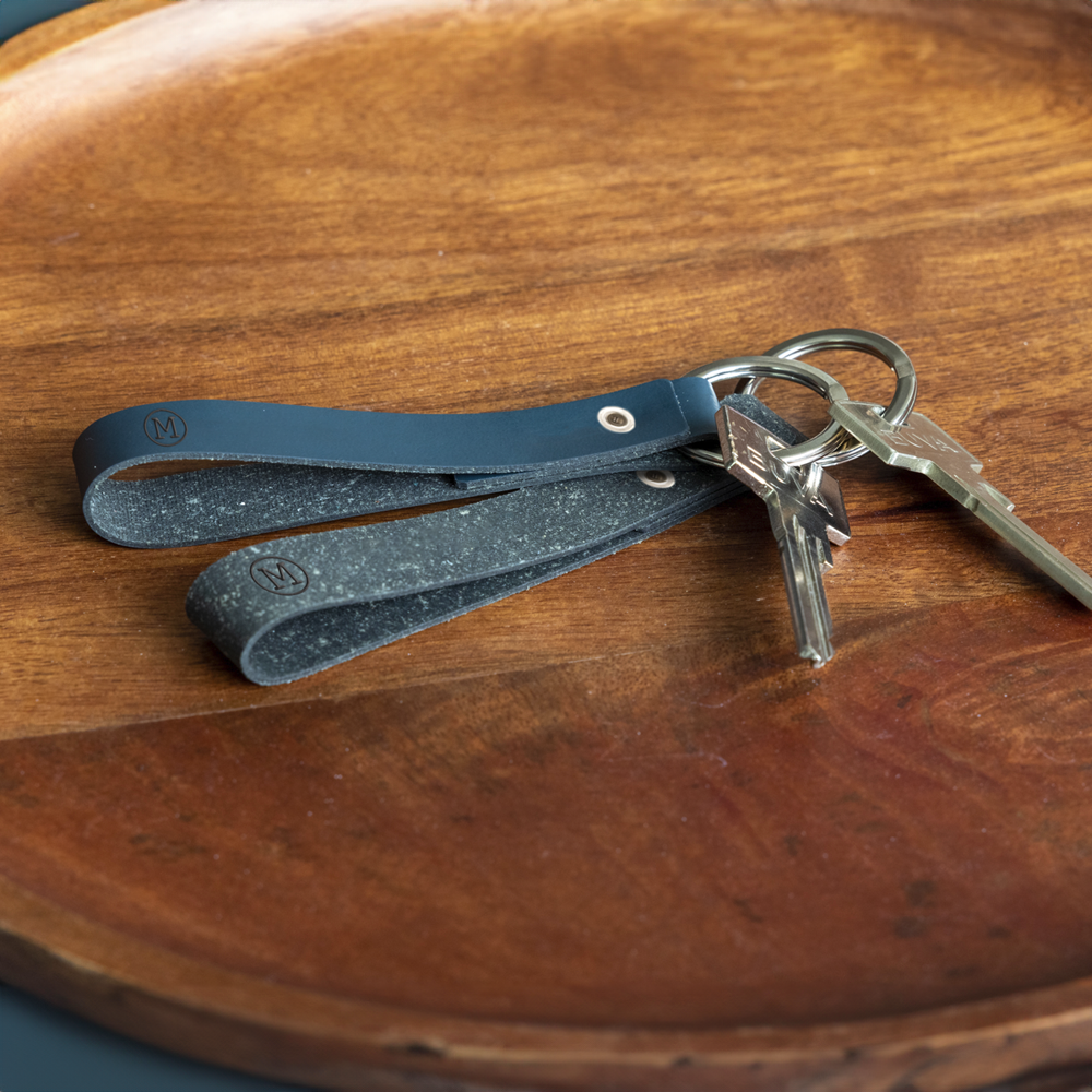Porte-clés fabriqué à la main à partir de déchets de cuir recyclés et de classeurs naturels. Fabriqué à partir de restes de la production de l'entreprise, ce porte-clés est robuste et présente une belle finition mate avec un parfum de cuir véritable. La couche supérieure colorée est une fine couche de PU à base d'eau. Il est accompagné d'un solide porte-clés en métal. Idéal pour ajouter une touche durable à vos clés.