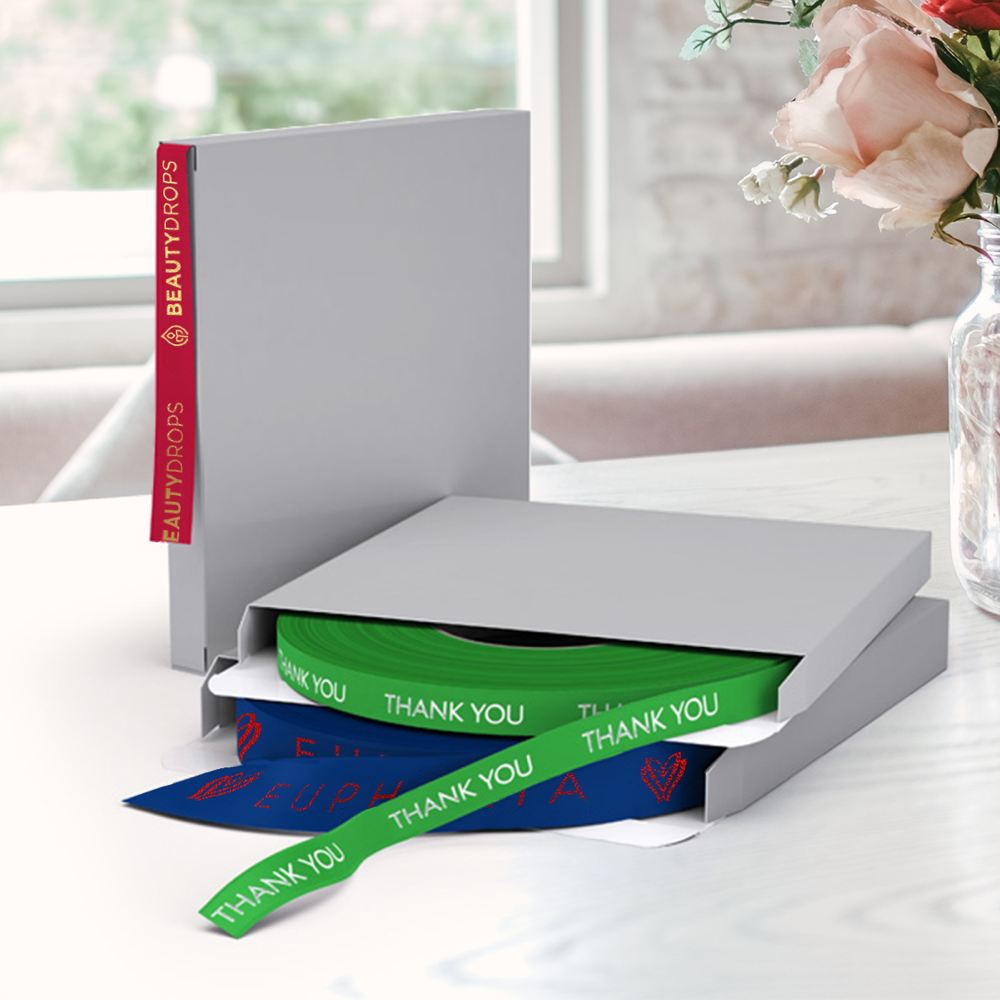 Personnalisez vos colis, vos boîtes ainsi que vos cadeaux avec ces rubans et surprenez vos proches et clients. Fabriqués à partir de matériaux 100% polyester, vous pourrez choisir entre un aspect coton, un toucher satin ou polyester recyclé. Vous pourrez imprimer votre logo ou votre design sur une zone de 1,5 cm ou 2,5 cm, le motif sera imprimé en continu sur toute la longueur du ruban avec une distance de 1 cm entre chaque motif. Choisissez entre 8 couleurs de base et 4 dorures pour une finition exclusive. Personnalisez vos rubans dès maintenant et offrez à vos proches ou clients une expérience unique.