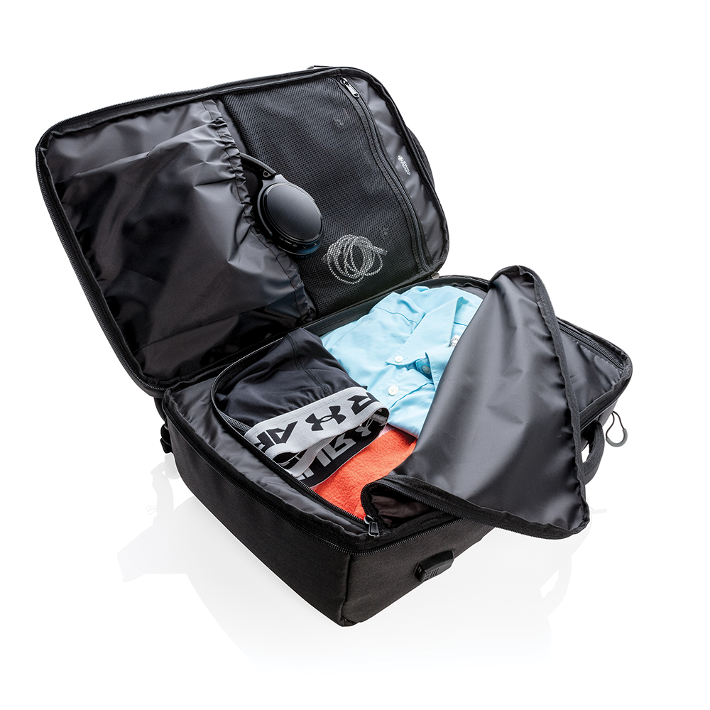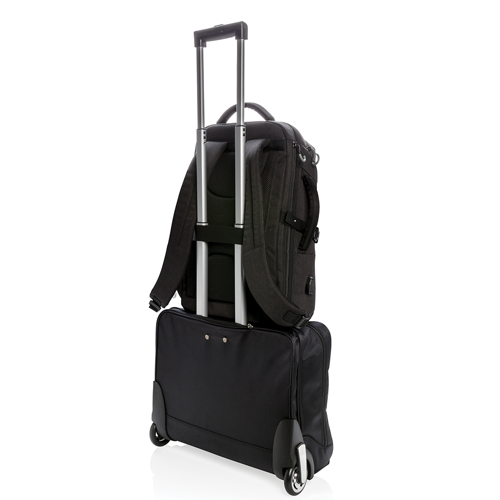 Parfait pour les escapades du week-end. Ce sac à dos spacieux dispose d'un compartiment rembourré pour un ordinateur portable de 17 pouces, facilitant les voyages. Il comprend une sangle pour trolley, une poche pour bouteille d'eau, un port USB et des poches RFID sécurisées. Fabriqué à partir de PET recyclé pour minimiser l'impact environnemental. Chaque sac recycle des bouteilles PET, en faisant un choix éco-responsable pour vos voyages. Sans PVC et conçu pour la commodité et la mobilité lors de vos déplacements.