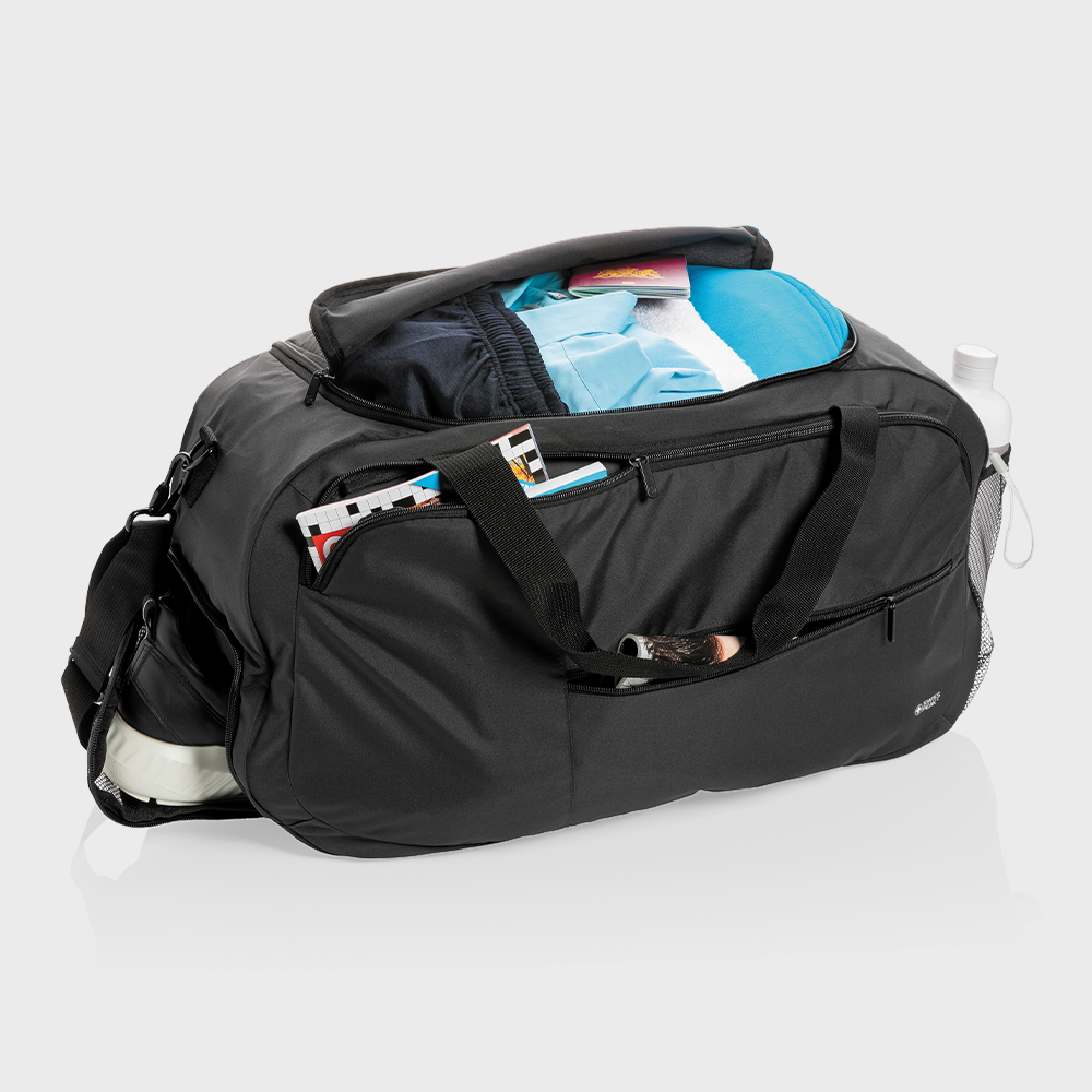 Allez à la gym ou partez en escapade facilement avec ce sac moderne et élégant. Il possède une large ouverture pour accéder rapidement à vos affaires. Il dispose d'une poche avant spacieuse et de deux poches en mesh extérieures, idéales pour vos accessoires. Portez-le comme vous le souhaitez grâce aux sangles polyvalentes, en sachant qu'il est fabriqué en polyester recyclé. Choix éco-responsable pour vos aventures !