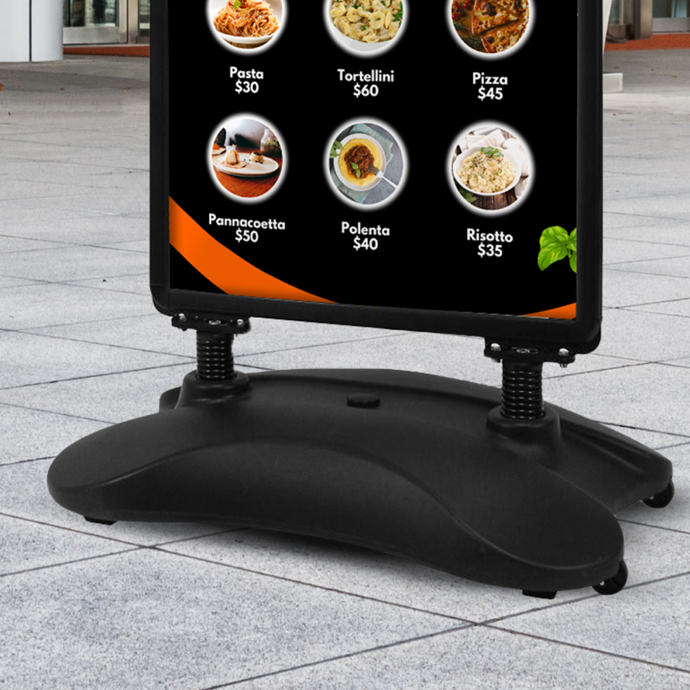 Soyez créatif avec ces stop-trottoirs résistants et assurez-vous que votre message soit visible en extérieur. La base à eau assure la stabilité et contient des roues qui permettent de la déplacer facilement. Vous pouvez personnaliser et placer des affiches pour affichez vos promotions, offres ou services. Le stop-trottoir double face vous permettra de gagner en visibilité des deux côtés de la rue.