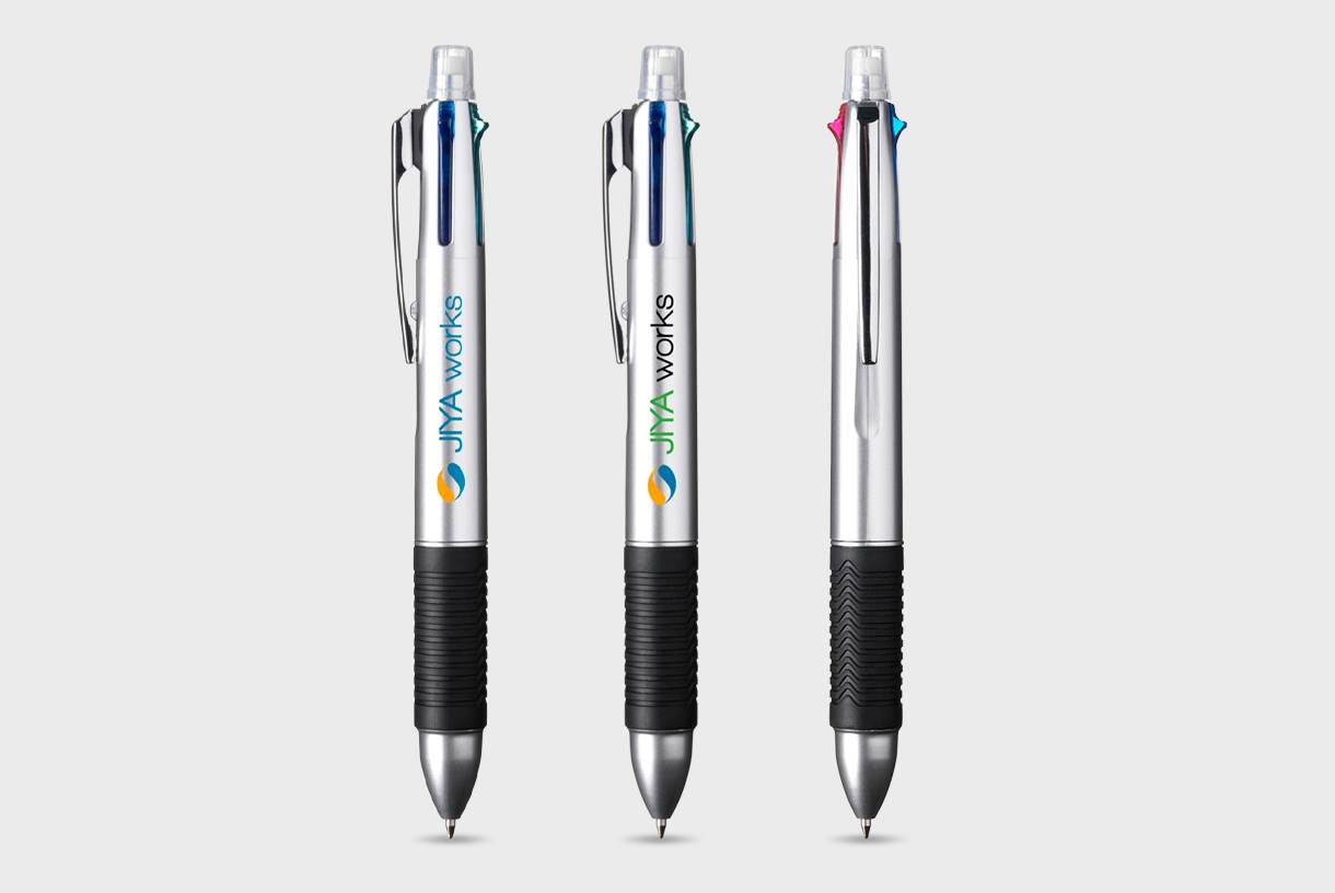 Stylo à bille 4 couleurs avec porte-mine tout en un. Avec une gomme détachable sous le capuchon. Encre bleue, verte, rouge et noire. En faisant glisser le clip vers le bas, le porte-mine apparaît.