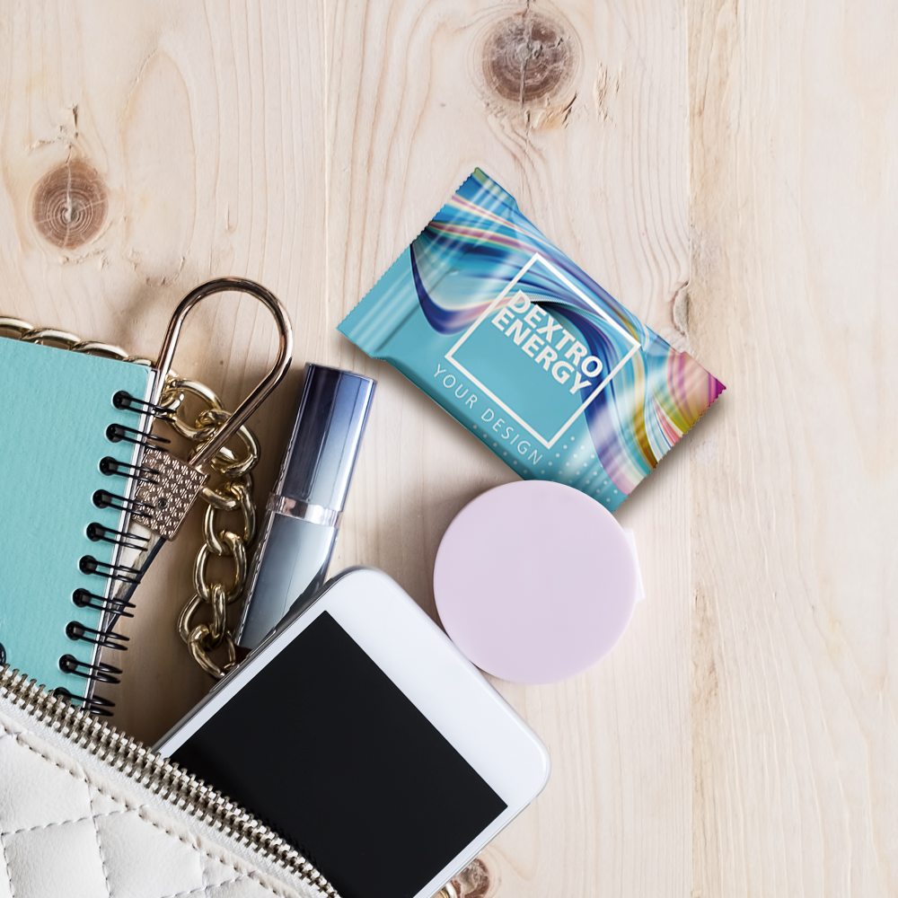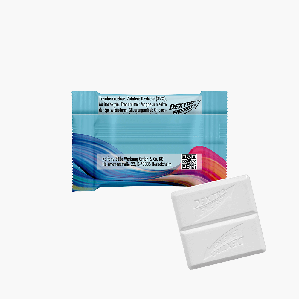 Le coup de pouce énergétique pour votre publicité : Les tablettes DEXTRO ENERGY sont emballées individuellement dans un flowpack publicitaire blanc. Concevez cet emballage publicitaire selon vos souhaits et offrez un article de marque qui impressionne par sa qualité et son goût.