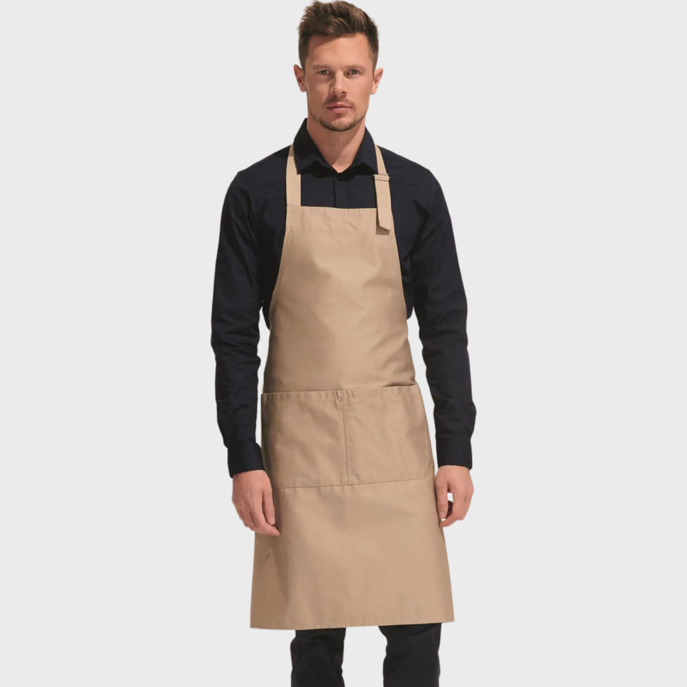 Un tablier facile à entretenir, doté d'une grande poche avant avec deux compartiments et d'un col réglable avec boucle métallique. Parfait pour protéger vos vêtements pendant la cuisine ou d'autres tâches salissantes.