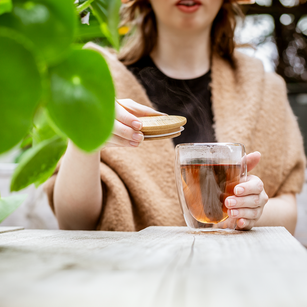Gardez vos boissons chaudes et vos mains au frais avec ce verre à double paroi élégant. Fabriqué en verre borosilicaté de haute qualité, il est équipé d'un couvercle en bambou avec un anneau en silicone. Le design intelligent maintient la paroi extérieure froide au toucher. Livré dans sa propre boîte en carton.