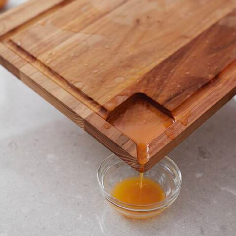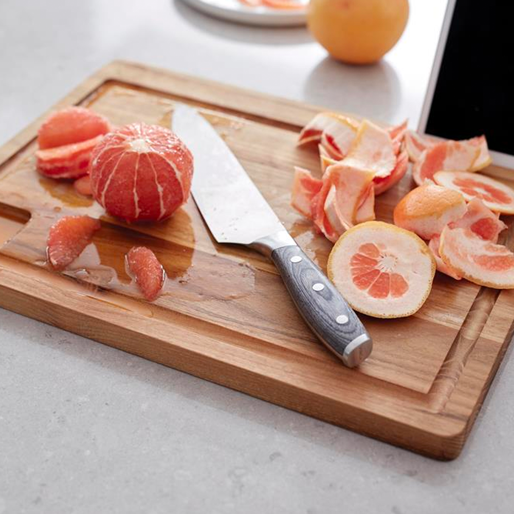 Cette planche spacieuse vous permettra de trancher, découper et servir vos créations culinaires, tout en gardant vos recettes numériques préférées bien en vue grâce à son support technologique astucieux. Fabriquée en teck certifié FSC®, elle n'est pas seulement fonctionnelle, elle est aussi écologique. La rainure profonde retient les liquides renversés, ce qui facilite le nettoyage. Parfait pour le chef moderne qui aime une cuisine bien rangée et la terre.
