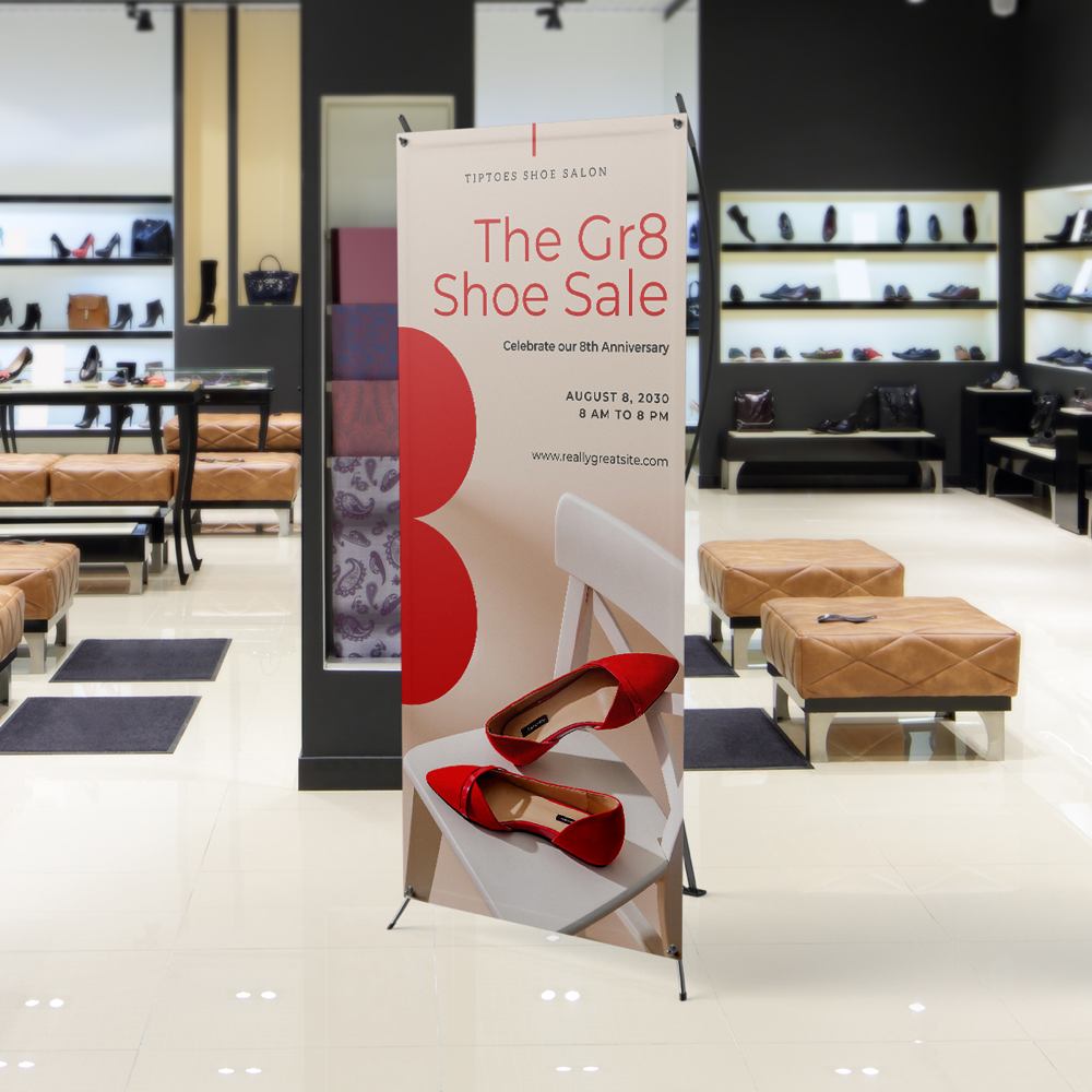 Un Kakemono X Banner est un affichage sur PVC avec un cadre. Le résultat est un magnifique visuel accompagné d’un beau cadre qui le maintiendra solidement à sa place.